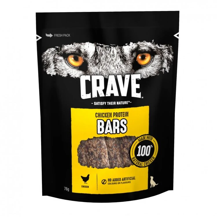 Crave Chicken Protein Bars are dog treats made with high quality ingredients; including 100% natural chicken, providing a delicious source of protein for your pet. Made with no added artificial colours or flavours; for a taste dogs will instinctively love. Crave™ Chicken Protein Bars come in a fresh, resealable pack to help keep them fresh.