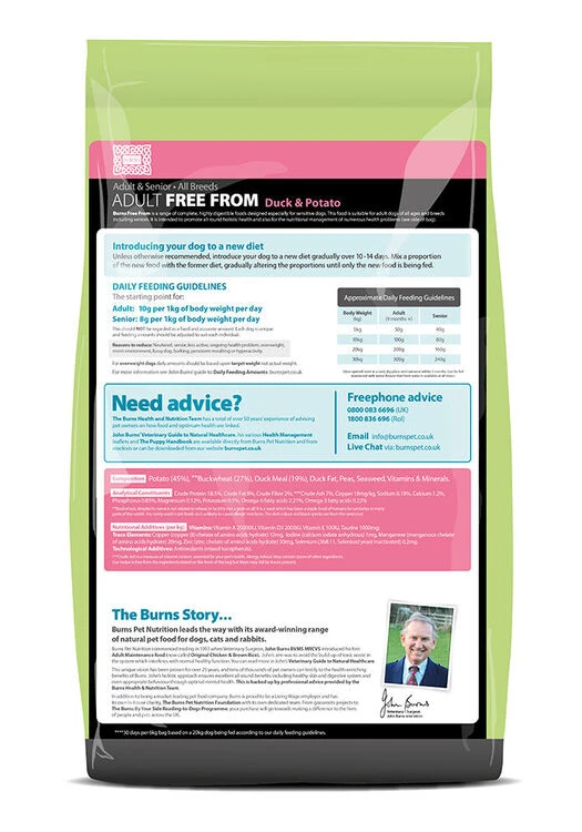 Carefully crafted by popular demand, the Duck & Potato contains all the usual benefits of the Burns diets in a Free From formula. Duck is a novel protein source; this means that if your dog has never eaten it before they will be less likely to have a reaction. The combination of duck and buckwheat makes this food particularly tasty so it’s also a great option for fussy dogs.