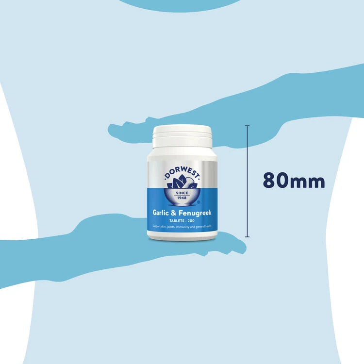 One of our best sellers for 60 years, and a fundamental Dorwest herbs ‘staple’ product, packed full of natural active compounds to support general health and help keep your pet feeling their best. Garlic and fenugreek are both known for their beneficial health properties; garlic provides supportive, soothing and cleansing effects, as well as helping to maintain the body’s defences against parasites and infectious agents. While fenugreek contains soothing and antioxidant compounds to neutralise free radicals. The beneficial effects are seen across multiple body systems, including the skin, joints and immune system: