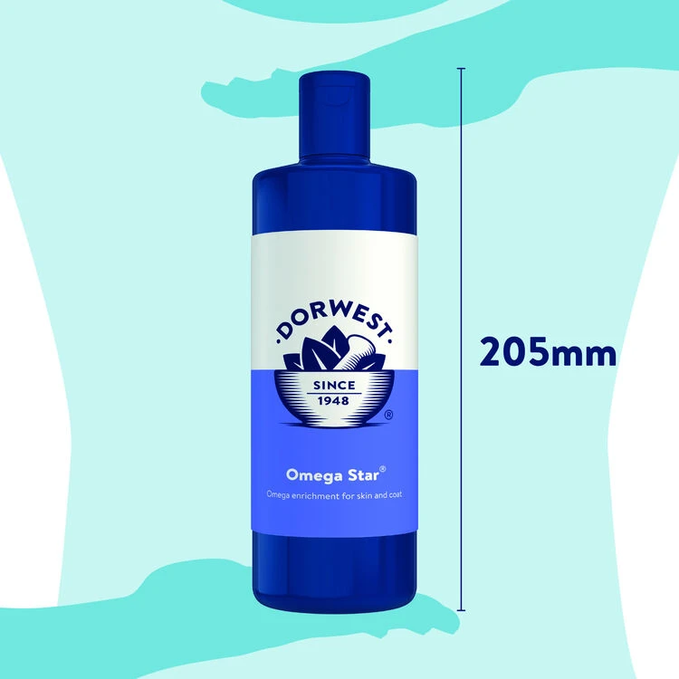 Especially formulated to promote a healthy skin and coat, our Omega Star® For Dogs oil is ideal for pets who want to look their best and to support those with skin conditions.  Containing a naturally balanced blend of omega oils and vitamin E, this oil moisturises, nourishes and soothes the skin while supporting quality coat growth, naturally restoring coat shine and reducing shedding. Â