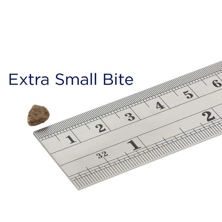 The kibble is shaped and smaller, approximately half the size of our small-kibble complete food.
