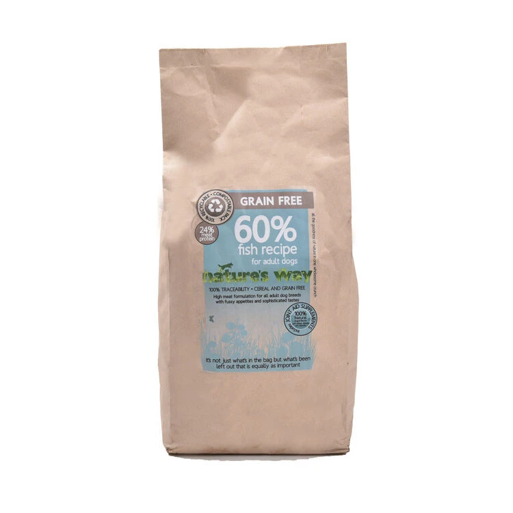 Nature’s Way Grain Free Fish Dog Food is made from 80% fish and potato. The recipe is perfect for dogs who are fussy or suffer with food allergies and intolerance.Â
