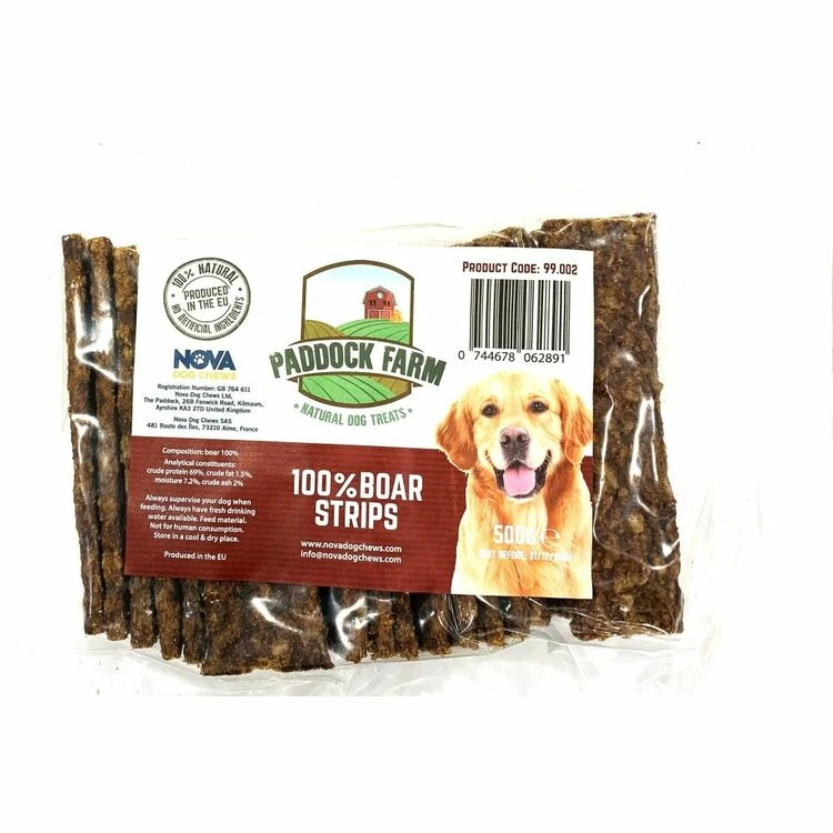 100% natural Wild Boar in 500g packs from the Nova Dog Chews Paddock Farm range. SIngle protein, all natural treats. Easy to break up and use as a training treat.
