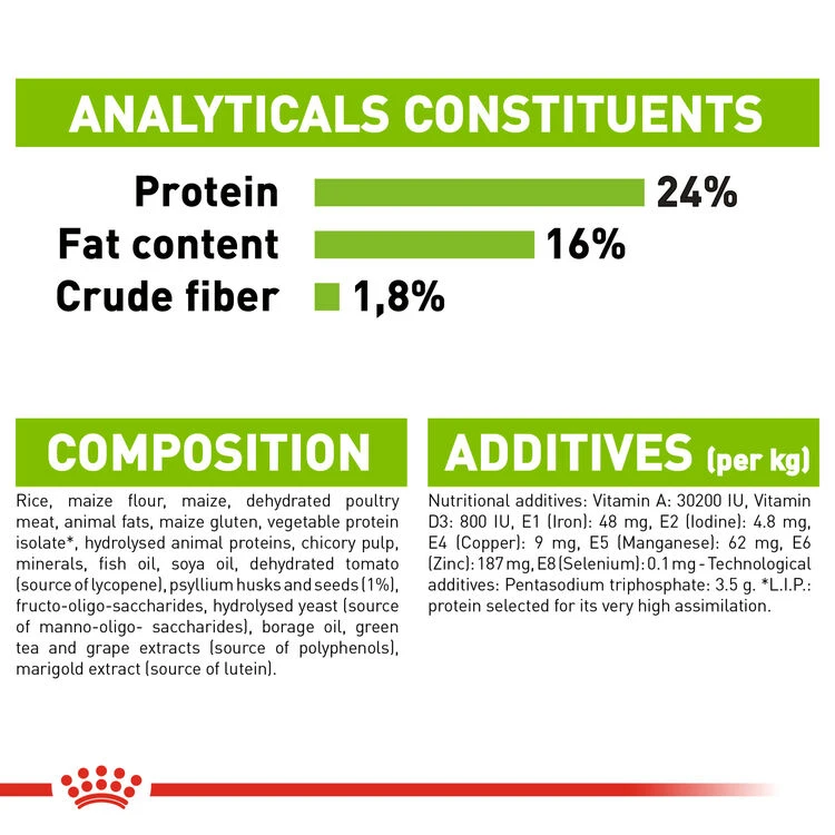 Additives: Vitamin A: 30000 IU, Vitamin D3: 800 IU, E1 (Iron): 50 mg, E2 (Iodine): 5 mg, E4 (Copper): 15 mg, E5 (Manganese): 65 mg, E6 (Zinc): 149 mg, E8 (Selenium): 0.11 mg – Sensory additives: tea extract (source of polyphenols): 150 mg – Preservatives – Antioxidants. * L.I.P.: protein selected for its very high digestibility.